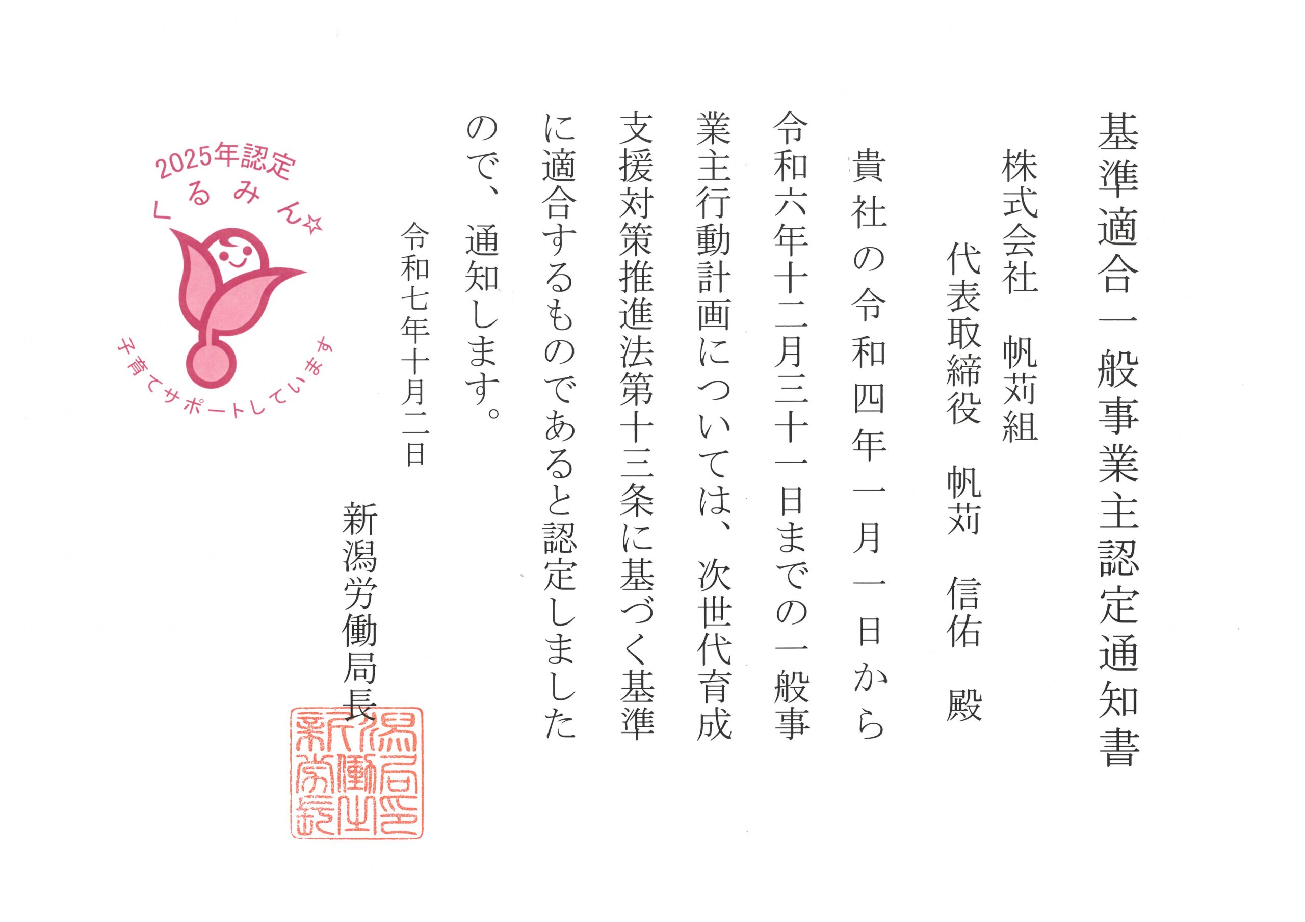 弊社は、次世代育成支援対策推進法(以下「次世代法」)に基づく認定(くるみん認定)企業として、2025年10月2日付で認定され、10月28日新潟労働局にて通知書を交付いただきました。